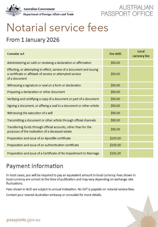 Our Passport and Notarial Service fees have increased. Effective from 1 January 2026, the following fees will apply: